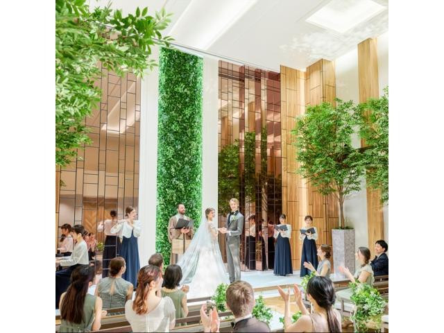 【リニューアル完成!”けやき並木のチャペル”】けやきの木が並ぶ緑豊かな新空間◆屋内にいながら木漏れ日を感じる人気チャペルで感動の入場体験を◆ムービー演出なども楽しめて結婚式当日のイメージも湧くはず♪