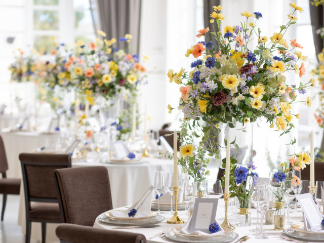 【ゲスト全員の記憶に残る心を尽くしたおもてなし】食事は自然体で楽しんでいただきたいから箸でもお召し上がりいただけるものを。会場装花はフローリストがゼロからデザインした花々が、会場を彩ります。
