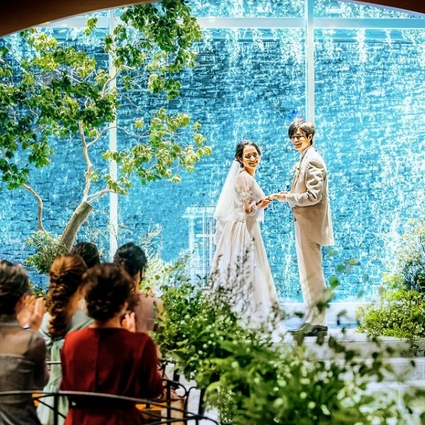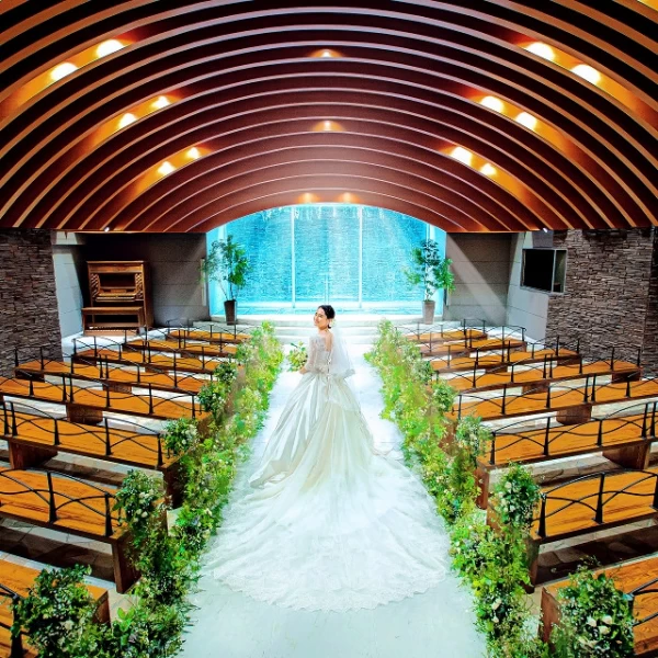 | おすすめ ポイント | 水・光・樹など自然美に包まれた幻想的な空間 ガラス張りの聖壇後に降り注ぐ自然光と、流れる滝の水音が神秘的なセレモニーを演出 挙式後はアフターセレモニー専用空間「Luce」で、ゲストと温かなひとときを |