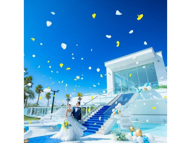 【憧れを叶えるオーシャンビューチャペル】花嫁の憧れを叶えるチャペルへおふたりで入場体験♪海を目の前に行うことができる大階段でのフラワーシャワーの様子を体感してみよう!