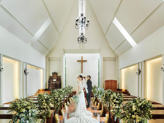 【緑と光に包まれた「木の教会」】天然木のバージンロードを備え緑と自然光あふれる教会は、天井高・バージンロード10mで開放的。フォトウエディングではチャペルでの撮影もOK!見学でイメージをふくらませよう