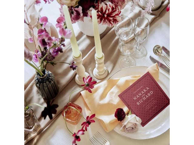 専属コーディネーターが手掛ける会場で今流行の装花やテーブル装飾などを確認。また、テーブルクロスやお花など具体的にイメージがある方はここで相談してみても。