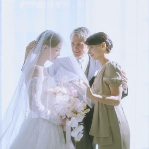 全体的に白で統一されていて、天井が高いです。バージンロードがガラス張りになっていて、花が敷いてありとても綺麗です。そのピンクや白の花と同じ色合いの花が式場内を彩っていて可愛らしくもあり美しさもありました。壁には光を反射するダイヤの様なものが含まれているそうで、大きいガラス窓から入ってくる光を効果的に広げているようです。バージンロードが短いという口コミを見ましたが、そもそも少人数であれば充分であると思いました。星空ウエディングがしたくて選びましたが、雰囲気も良く出ていて満足いたしました。夜空とカーテンを開けたあとの明るい昼の空のコンセプトがいい演出になりました。音響もお任せでしたが、反響も良く耳障りの良いバランスでした。1回目の下見でラグナヴェールさんにお伺いしましたが、挙式会場を見て夫婦ともに即決でした。披露宴会場は、私は挙式会場と同じフロアにある2つ種類があって温かみのあるウッド調のにしました。ワンフロアで移動が完結するため、他のお客さんとバッティングすることなく式に集中できました。階段などもないため、高齢の方にも優しい作りになっています。披露宴会場の大きさは10人で横に机を1列に並べて会食形式にし、夫婦も同じ机に参加する形でした。それでも周囲にダミーの円卓を置いてくださるので空間が余って仕方がないということはありません。そもそも少人数での実施なので大きな会場では少し寂しい雰囲気になってしまうところをある程度のサイズ感でちょうど良かったです。会場内の装飾品も本棚の様なオシャレな場所に花を添えることもできるので、アレンジも楽しめると思います。東京駅からも近いですが、東京メトロ銀座線京橋駅から目の前なのがとても良かったです。遠方から参列する人がいる場合は、新幹線の止まる東京駅近くは交通の便としては最高だと思います。また京橋駅周辺がオフィスが多く、落ち着いた環境でした。繁華街にありがちな店の宣伝が騒々しいこともなく、人でごった返していることもないため治安も良くて安心できます。ドレスを選ぶお店も直ぐ側にあるので、スケジュールさえ合えば同時に進められます。プランナーさんとの打ち合わせに向かう度に、東京駅近くにいけるのもワクワクする気持ちを高められるので式場の立地は大切だと思います。ただ、ホテルの式場と違って、ビルの中にあるので一階は飲食店で間に一般企業が入っています。その点が気になる人はいるかなと思いますが、私はその場の空間が大切だったので外見は関係ありませんでした。挙式担当の方は、ハキハキとリードしてくれたので安心できました。ありがちなミスやポイントを教えてくれていたのでイメージしやすかったです。披露宴担当の方は、ユーモアもありつつ進行をスムーズにしてくれてありがたかったです。スタイリストさんは、趣味の話にずっと付き合ってくれつつ仕事もしてくれてリラックスして式に臨めました。プランナーさんも、ムービーや写真などやった方が思い出に残るというメリットもしっかりと伝えつつ、無理強いはせずに提案をしてくれました。私が困っていそうなことは察して「伝えておきますね」とフォローを入れてくれてありがたかったです。式が終わって最後の最後まで素敵なサービスをしてもらって、気持ちが幸せになり帰り道に夫と楽しかったねと言い合えた結婚式になりました。◯貸し切り空間施設を午後貸し切れたので、プライベート空間が維持できる点です。大きなホテルにあるような宿泊客やレストラン利用者などの関係のない人が入れ乱れるような事がないのでセキュリティ的にも安心ですし、会場内の小回りが利く点が良かったです。挙式会場から披露宴会場までワンフロアで分かりやすいので、高齢の方が参列するのにも安心です。◯とにかく置いてあるものがオシャレロビーや披露宴会場前の空間も、ソファやピンクのオブジェなどオシャレな装飾があるのでとても映えます。自分の持ち込みの写真や思い出の品などが少なくても良い雰囲気を作ることができます。友人同士で写真を撮る際も記念の1枚になります。◯司会を立てずとも、進行を安心して進められた私達は10名の少人数での式だったので、披露宴で司会を立てませんでした。不安もありながらも少人数で仰々しく司会者がいる感じもアットホームさに欠けると思い、無しにしました。式場のスタッフさんがタイミングによって声をかけてくださり、適切に進行してできました。ありがたかったです。◯準備について結婚式の準備の準備が大切だと思います。私はこだわりがあまりなく、絶対に叶えたい理想も少なかったです。そのため準備もコンパクトでけれど楽しくて私たちはとても満足でした。ただもっとこうしたいというコンセプトを早めに決めれば、アイディアも多く出てきてより充実した結婚式になると思います。星をテーマにしたいと伝えると、こんなところに