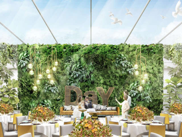 挙式会場「Celebration Hall-The Nature」天井から降り注ぐ花びらのオブジェを鏡に映し、光の輝きでおふたりを祝福。この夏新たに誕生するNewチャペルは必見!初見学限定<挙式料11万円>プレゼント実施中