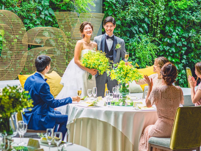 【開放的なテラス付き会場】少人数専用にリニューアルした空間は陽光と緑に包まれ贅沢に。伝統受け継ぐこだわりの美食は専属シェフがオープンキッチンで目の前で仕上げる。おふたりだけのプライベートウエディング◎