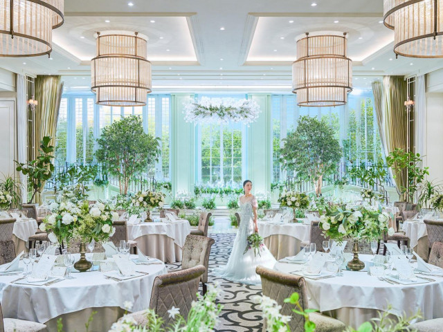 駅徒歩圏の好立地のためゲストが気にする会場移動や宿泊も負担がかからず安心。全天候型ガーデンがあるため季節や天候を気にせず希望の演出が叶う。駅近とは思えないほど豊かな緑を感じるおふたりらしい1日が叶う。