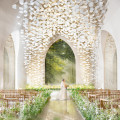 堂々完成!新たな祝福の空間が誕生。【新チャペル】見学スタート!天井から降り注ぐような花びらのオブジェと緑の設え。柔らかな光が緑に反射し、輝きが全体を包み込む。都心にありながら自然が織りなす洗練空間。