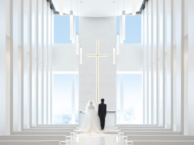 【天空のチャペル】地上110m、美しい眺めを望むチャペル。その特別な空間は、白大理石に反射する自然光に包まれ、おふたりもゲストも息をのむほど。当フェアでは、当日をイメージした入場体験が可能です。