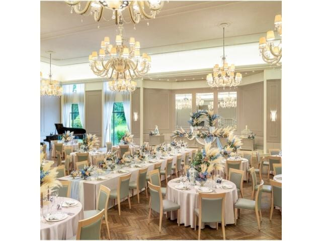 【イメージが膨らむ会場見学】結婚式当日を再現した会場をご見学いただけます。目の前に広がる大庭園と華やかさを放つ空間を訪れれば、感動に心が震えること必至。“ここでしか叶わない”趣ある結婚式を実現します。