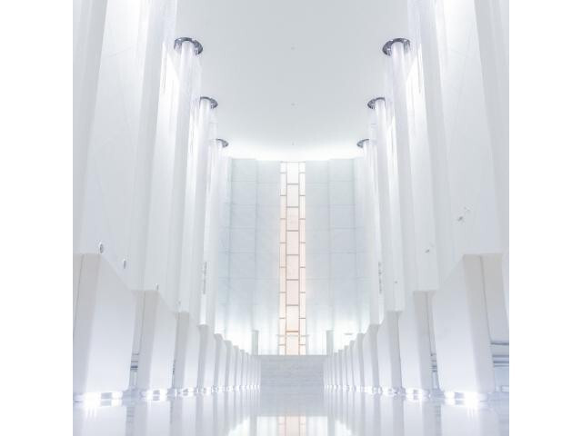 【白亜のセレモニースペースWYN(ウィン)】純白の大空間で叶える結婚式。8段の祭壇に実際に上がってみてみれば当日の雰囲気が。そこからゲスト一人ひとりと目線を交わし、心通う結婚式の体感ができます。
