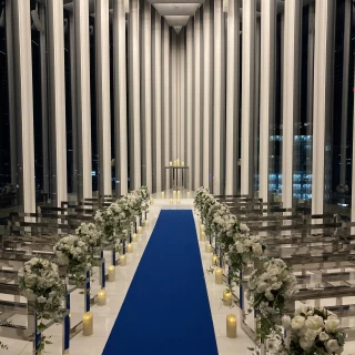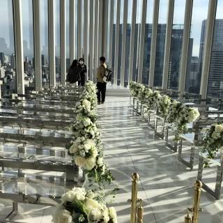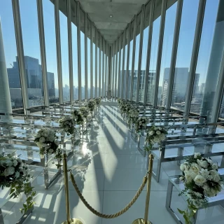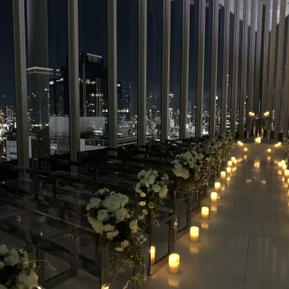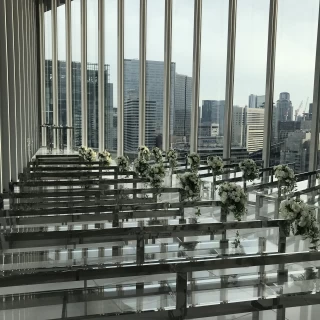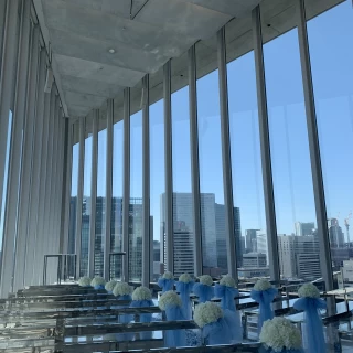 建物の高層階にある挙式会場であるため、とても景色がよく、見渡せる窓がありました。当日ははじめは曇りでしたが、挙式中に晴れ間が差してきて、とても神秘的で素敵な演出のように感じました。このような高層階の挙式会場はなかなか見られないので驚きでした。披露宴会場は円卓ではなく、横長の机で珍しいなと思いました。個人的には円卓のほうが新郎新婦を見やすかったり、周りの人と話しやすいため少し残念でしたが、挙式会場同様に高層階にあるため、景色がよく見える窓がよかったです。料理はオシャレなものが多く、味も美味しかったので満足でした。初めて大阪での結婚式で、場所に不安がありましたが、梅田駅から徒歩でアクセスできる位置にあったので迷うことなく到着できました。県外の人にも優しいロケーションだと思います。高層階にあることでとても景色がよく、都会を見渡せるのがよかったです。詳細を見る (376文字)