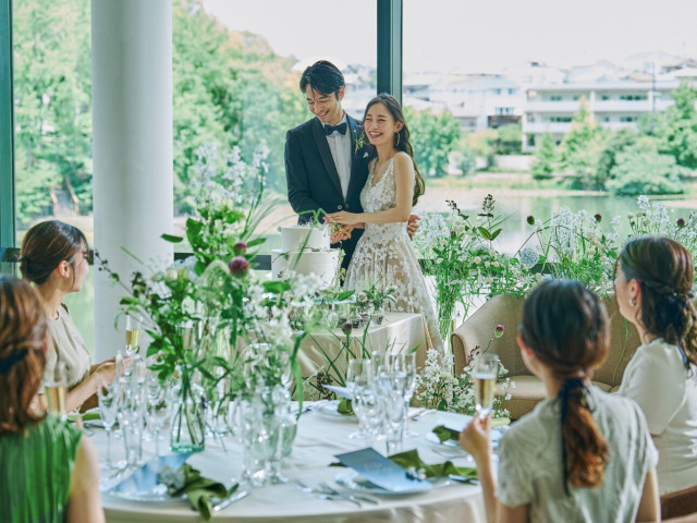 【タイプの違う2つの披露宴会場】あやめ池を一望できる絶好のロケーション!テラスや階段など入場方法もお選びいただけるのはイリスならでは!それぞれタイプの違う会場でおふたりらしい自由な時間をご提案