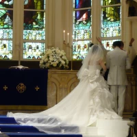 青い絨毯に大きなステンドグラス、とても豪華なチャペルです。式場内の装花も白で統一され、ウエディングドレスが際立っていました。挙式後は大階段でのフラワーシャワーが印象的です。ゆっくり降りてきてくれるので、しっかりお祝いできます。