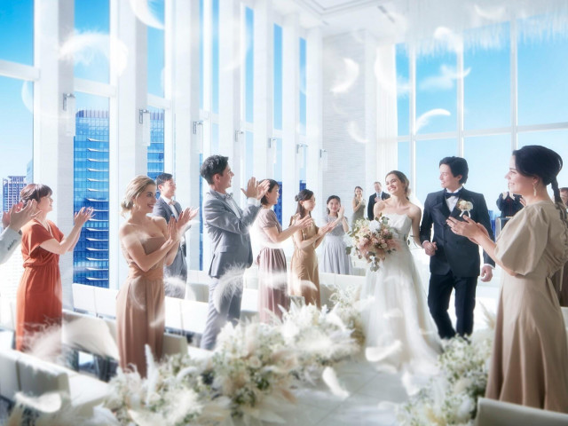 【地上150mにある絶景スカイチャペル】大阪・神戸を一望できるラグナヴェールプレミアならではの天空に誓うチャペルを堪能。抜群の眺望と降り注ぐ光に包まれた感動の挙式空間を入場シーンで体感