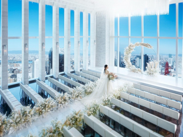 | おすすめ ポイント | 地上150mの天空チャペル!窓から臨む大阪の街と15mのバージンロードに連なる無数のスワロフスキー!特別な瞬間を特別なゲストと過ごすに相応しい、光溢れる天空のチャペル |