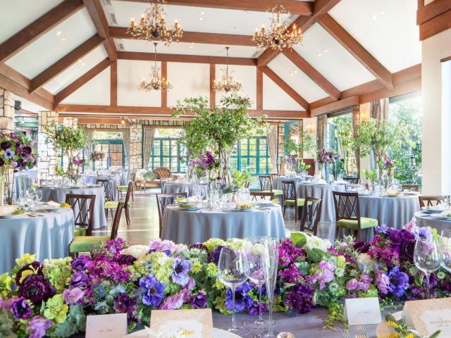 天井のステンドグラスと四方の窓から、やわらかな自然光が差し込み、緑やガーデンが望める心地の良い空間。テーマ毎のコーデによる雰囲気の違いや高砂からの目線やゲスト目線など体験して披露宴気分を味わって♪