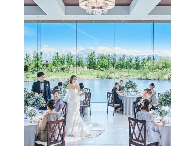 富山で唯一の3面ガラス張りのチャペル。緑と光が溢れる大人気の圧倒的絶景スポット。四季折々の立山の眺めも美しい♪環水公園の運河・緑もロケーション魅力の一つ♪写真や動画撮影にもおすすめ!是非!ご体感を。