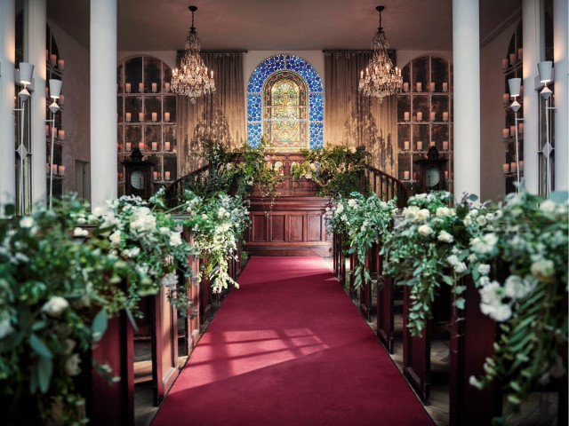【ふたりだけのオルゴール盤】かつての吹き抜けの大広間がチャペルとして生まれ変わり、ふたりの未来を誓い合う場所へ。「ずっとそこにあるもの」として受け継がれるオルゴールの音色が誓いのセレモニーを彩ります。
