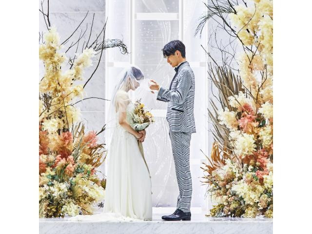 白のコントラストで彩るセレモニーステージ。自然光をたっぷりのやさしい雰囲気に天井高く煌めくクリスタルがふたりを見守ります。明るい空間でありながら誓いにふさわしい凛とした雰囲気を体感してください。