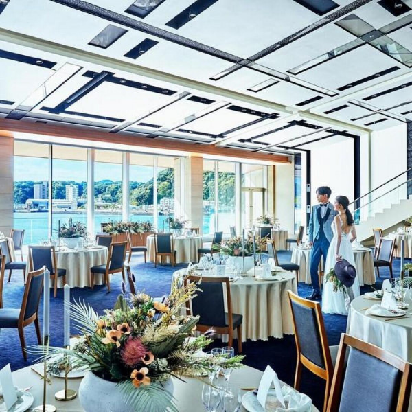 会場使用料150,000円(税抜き)特別値引き/ 瀬戸内海を一望するオーシャンビューの会場です。独立したビュッフェルームやプール付きのテラスも併設しております。音響照明費も含まれています。