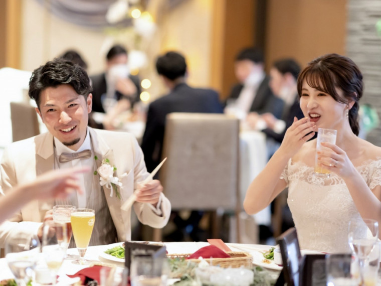 - 会場に移動してからも、ジャポナイズリサージュでは新郎新婦とゲストの皆様が一緒にお料理を食べながら楽しめるスタイルをご提案しています。この日も終始、お2人はゲストの皆様のお近くで特別な時間を一番大切な皆様と一緒に笑顔で過ごされていました!