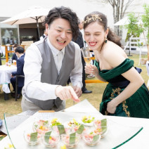 コース料理の一品目を一人一皿ではなく、会場の中でもなく、県内最大級のガーデンを使って、全20種類の前菜ブッフェとしてゲストに提供!新郎新婦もゲストも青空の下で、自由に食べて、呑んで、語って、笑って、写真をとって楽しみました♪