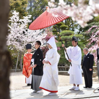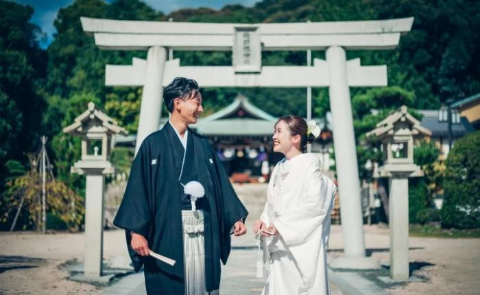 四季の緑が彩る神社の境内。和装が映える特別な場所。