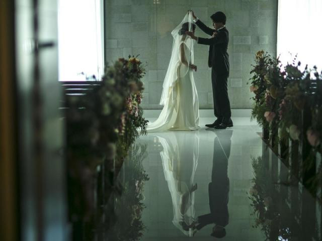 【入場体験】レストランながら充実設備が魅力のKubotsu。100名様まで着席可能なチャペルは壁一面に埋め込まれたクリスタルの輝きが印象的な空間。フェア当日はバージンロードを歩いてイメージを膨らませて