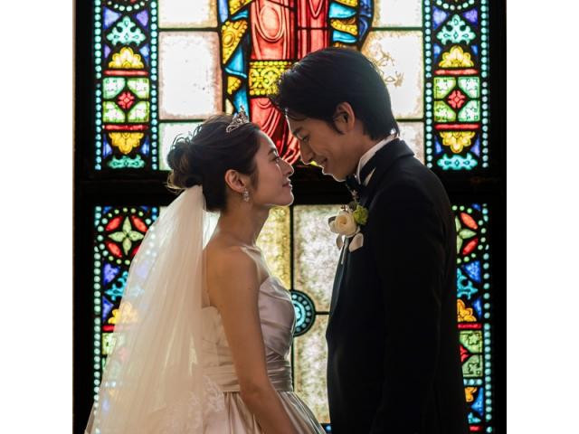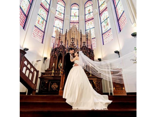おすすめ ポイント | 20mのバージンロード・ヨーロピアンアンティークのステンドグラス・祭壇・聖歌隊の生演奏 |