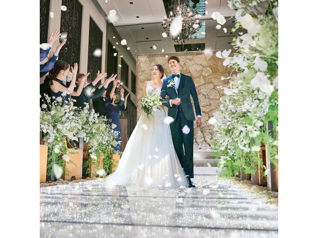 【光り輝く天空のバージンロード】ダイヤモンドを約40万個敷き詰めたチャペル。ドレス姿も映える光煌めくバージンロードを体感!大階段でのアフターセレモニー、親御様へ想いを伝える映像演出も必見です。