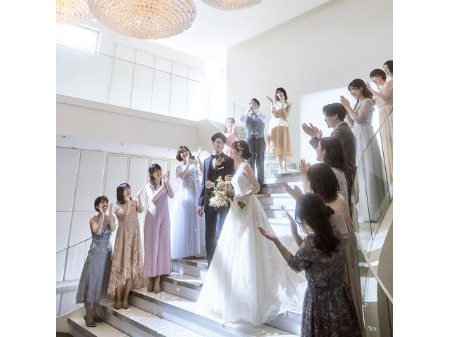 【光り輝く天空のバージンロード】ダイヤモンドを約40万個敷き詰めたチャペル。ドレス姿も映える光煌めくバージンロードを体感!大階段でのアフターセレモニー、親御様へ想いを伝える映像演出も必見です。