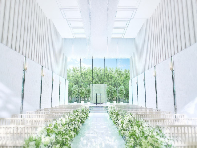 緑×青空×光に溢れた開放的なチャペルは、花嫁がクリスタルの輝きに包まれる特別な場所。花嫁気分で挙式での感動を体感してみて♪チャペル装飾のバリエーション豊富でお好みに合わせて雰囲気のアレンジも可能◎