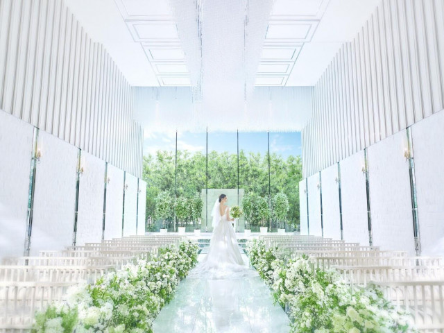 | おすすめ ポイント | 高さ6メートルの天井には5万個のクリスタルが煌めき、全長18mのバージンロードにはふたりの姿が映り込み幻想的な雰囲気を創り出す |