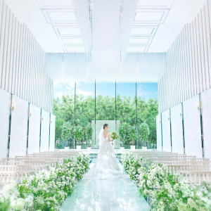 | おすすめ ポイント | 高さ6メートルの天井には5万個のクリスタルが煌めき、全長18mのバージンロードにはふたりの姿が映り込み幻想的な雰囲気を創り出す |