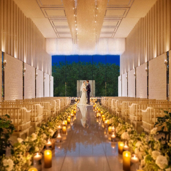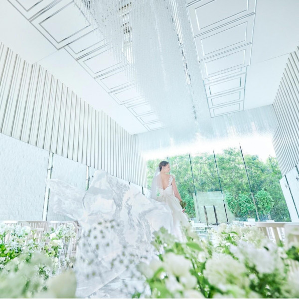 | おすすめ ポイント | 高さ6メートルの天井には5万個のクリスタルが煌めき、全長18mのバージンロードにはふたりの姿が映り込み幻想的な雰囲気を創り出す |