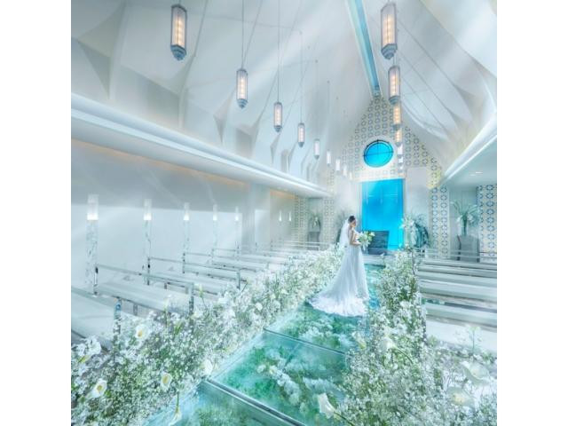 【お花を敷き詰めたガラスのバージンロードがある純白のチャペルでの挙式体験】四季折々の装花と緑あふれるチャペルでの入場体験が叶う!さらにホテルの中にある開放的なガーデンでのパーティー体験も♪