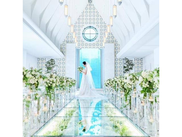 【お花を敷き詰めたガラスのバージンロードがある純白のチャペルでの挙式体験】四季折々の装花と緑あふれるチャペルでの入場体験が叶う!さらにホテルの中にある開放的なガーデンでのパーティー体験も♪