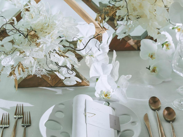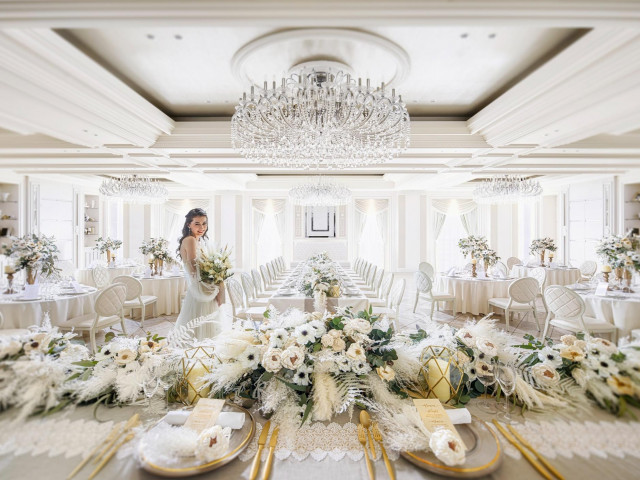 【白基調の美空間を自由に染める】白基調だからこそテーブルクロスや装花のデザイン次第で二人らしい空間にできる。緑や花々で彩られたナチュラルコーデはカジュアルになりすぎずに居心地の良さが表現できると好評◎