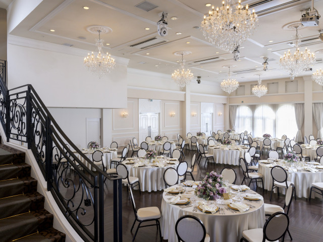 【圧迫感ない広々とした会場】2階フロア分吹き抜けの天井高が印象的な披露宴会場での大階段入場体験やおふたりらしいオススメ演出をご紹介!結婚式当日がイメージできる♪※予約状況によって見学不可の場合あり