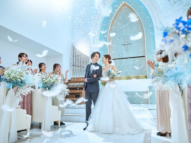 | おすすめ ポイント | 高さ8メートルの天井から光の祝福が降り注ぎ、心地よい水のせせらぎと響き合う美しい歌声、ふわりと舞う羽が感動へと導くフェザーシャワー。また、お二人のお好みにあわせてLEDライトで光の演出が可能! |
