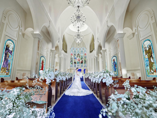 【人生で最も特別な日を彩る】たった"一日"しかない結婚式だからこそ"一生"の想い出に残るように。ステンドグラスが輝く本格的な大聖堂にはドレスが映えるロイヤルブルーのバージンロードと圧巻の13mの天井高