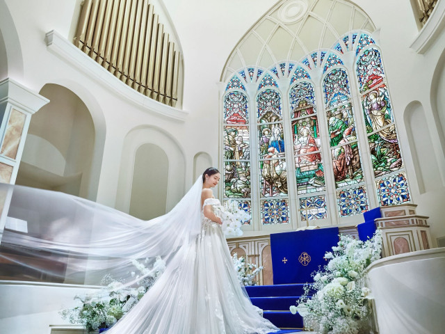 【人生で最も特別な日を彩る】たった"一日"しかない結婚式だからこそ"一生"の想い出に残るように。ステンドグラスが輝く本格的な大聖堂にはドレスが映えるロイヤルブルーのバージンロードと圧巻の13mの天井高