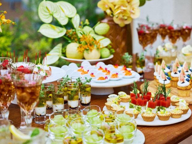 【幅広いアイテムをご提案】ご試食会やウェディングサロン内の展示でラインナップの一部をチェック。ウェルカムパーティーやデザートビュッフェではオリジナルメニューでゲストの皆様をおもてなし♪