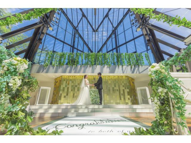 【チャペル見学】四季折々の美しい風景が広がる全面ガラス張りの開放的なチャペル。窓の外には緑や花々が咲きほこる豊かな自然が広がり、ふたりもゲストも肩ひじ張らずにセレモニーを迎えられるのが魅力です