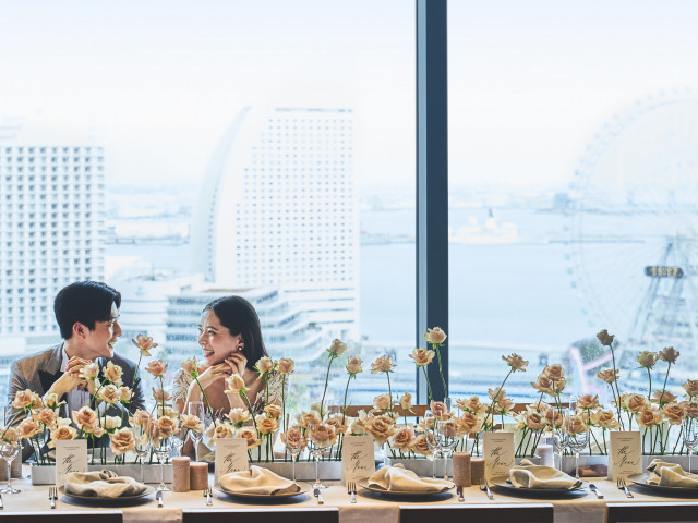 地上100mの高層フロアから横浜の街並みを一望できる披露宴会場。全面ガラス張りの空間は、昼は自然光、夜は夜景が彩る。洗練されたモダンデザインと貸切の贅沢さで、非日常のひとときを演出。