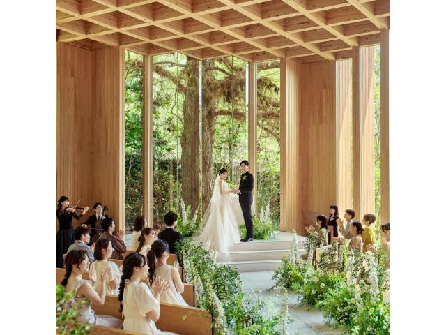 おすすめ ポイント | 木のぬくもりとガラスの清らかさを組み合わせた空間は、周囲の自然と調和。祭壇の向こうには、生命力あふれるシンボルツリーがあり、神秘的な姿で誓いのシーンを見守ってくれます。 |