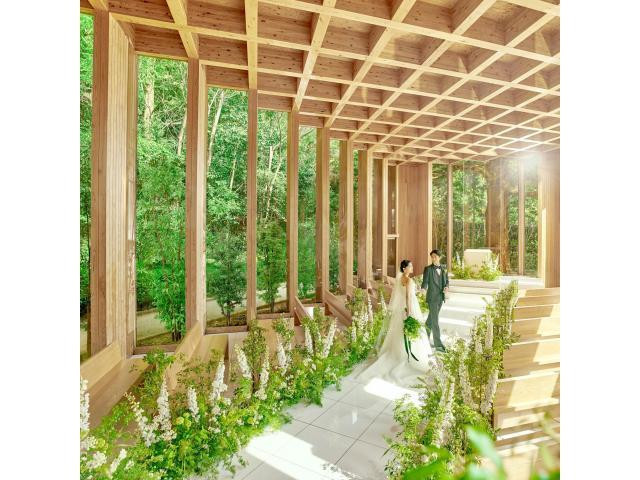 【シンボルツリーが見守る感動挙式体験】木漏れ日が降り注ぐ森の小径の先に佇む教会では、シンボルツリーが見守る中、大切な挙式入場シーンを体験できる。写真では伝わらない木の香りや生演奏の音色を感じて
