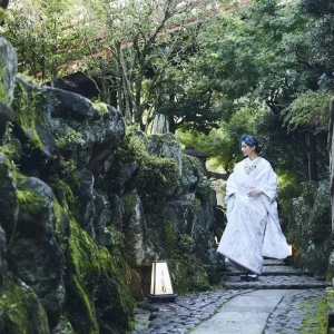 豊かな緑の中でのフォトショット。優美な和装との調和が美しい1枚に