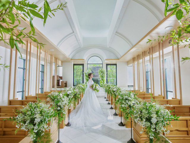 自然の光と水の流れを感じながらの結婚式。ドレス姿が最も美しく見える条件を全て揃えたエミリアチャペルをご紹介します♪さらにエミリアには、和の挙式ができる神殿も兼ね備えております!あなたはどっち?