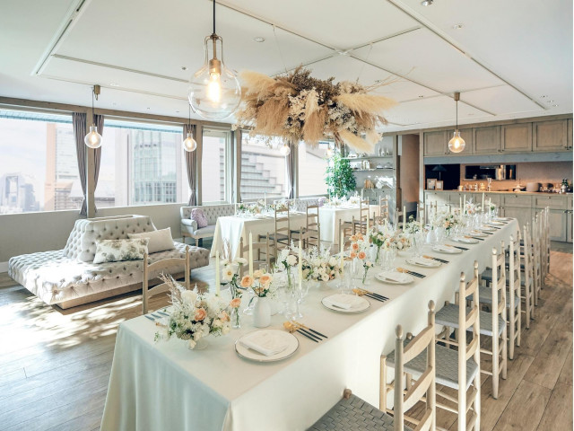 【パーティ会場『アフターリビング』】お家に招くようなアットホームなおもてなしが叶う、明るく開放的なパーティ会場。窓から自然光があふれるリラックス空間で、大切なゲストとの心温まる小さな集いを